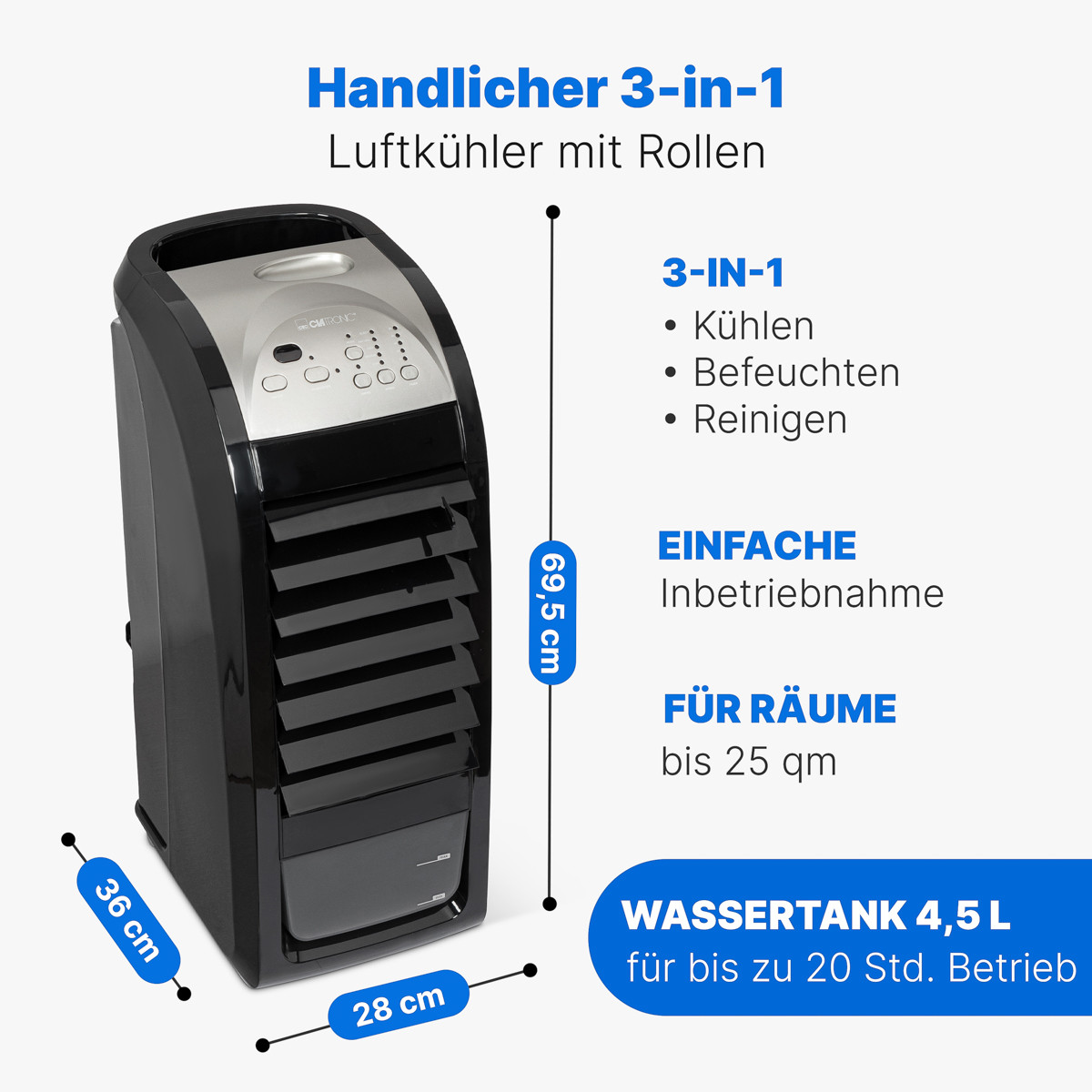 Мобільний повітроохолоджувач Clatronic LK 3742 розроблений для забезпечення комфортного та здорового мікроклімату. Його великий резервуар для води об'ємом 4,5 літра дозволяє працювати тривалий час без необхідності частого поповнення, зокрема, як зволожувач він може працювати до 20 годин без перерви. Об'єм випаровування становить 150 мл/год. Функція очищення повітря сприяє здоровішому диханню, зменшуючи кількість алергенів, пилку, домашнього пилу та бактерій. Керувати всіма функціями зручно за допомогою пульта дистанційного керування або інтуїтивно зрозумілих кнопок на панелі. Пристрій оснащений функцією перемотування кабелю для зручного зберігання. Працює від стандартної електромережі 230В, 50 Гц і споживає всього 70 Вт енергії, що робить його значно економнішим за традиційні кондиціонери.