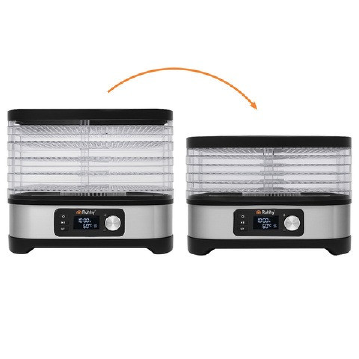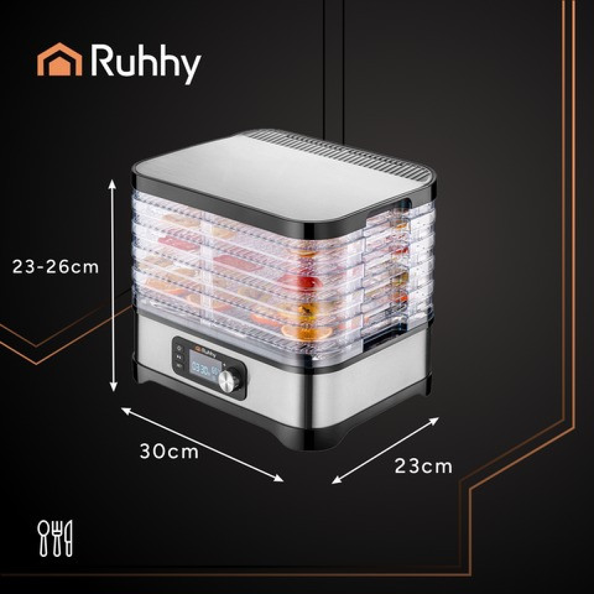 - КОНВЕКЦІЙНИЙ ВЕНТИЛЯТОР: Забезпечує рівномірне сушіння на всіх рівнях, гарантуючи ефективність сушіння понад 80%.