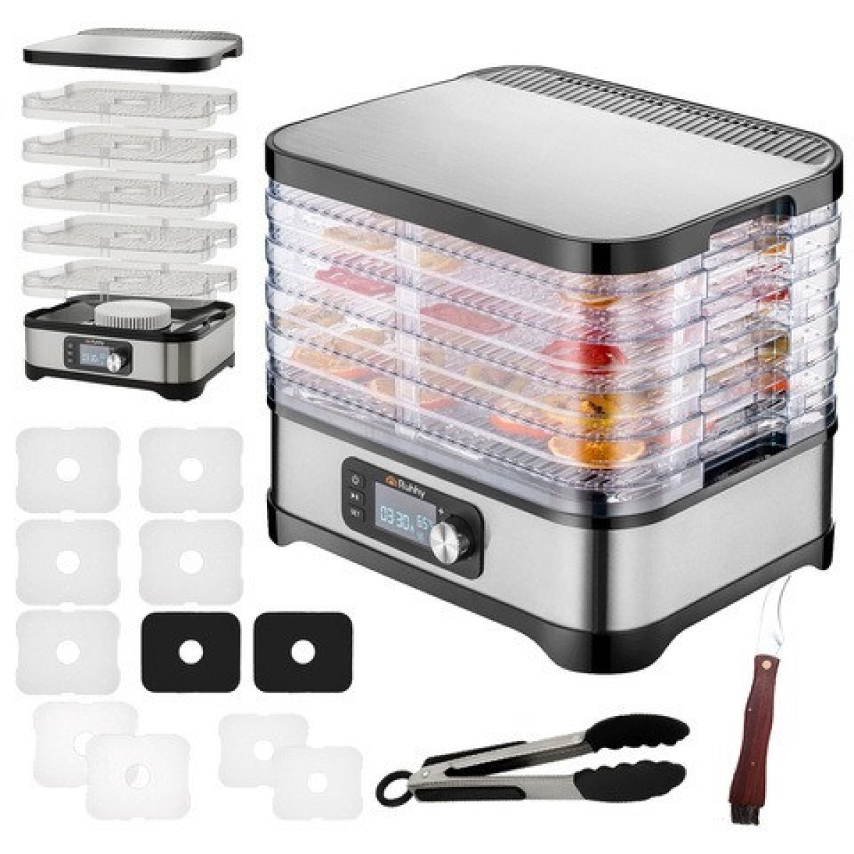 - КОМПЛЕКТ СПЕЦІАЛЬНИХ ЛОТКІВ: Включає 2 лотки для рідких продуктів, 2 сітчастих піддони та 2 антипригарних килимки для роботи з різними типами сировини (наприклад, пюре, пастила).