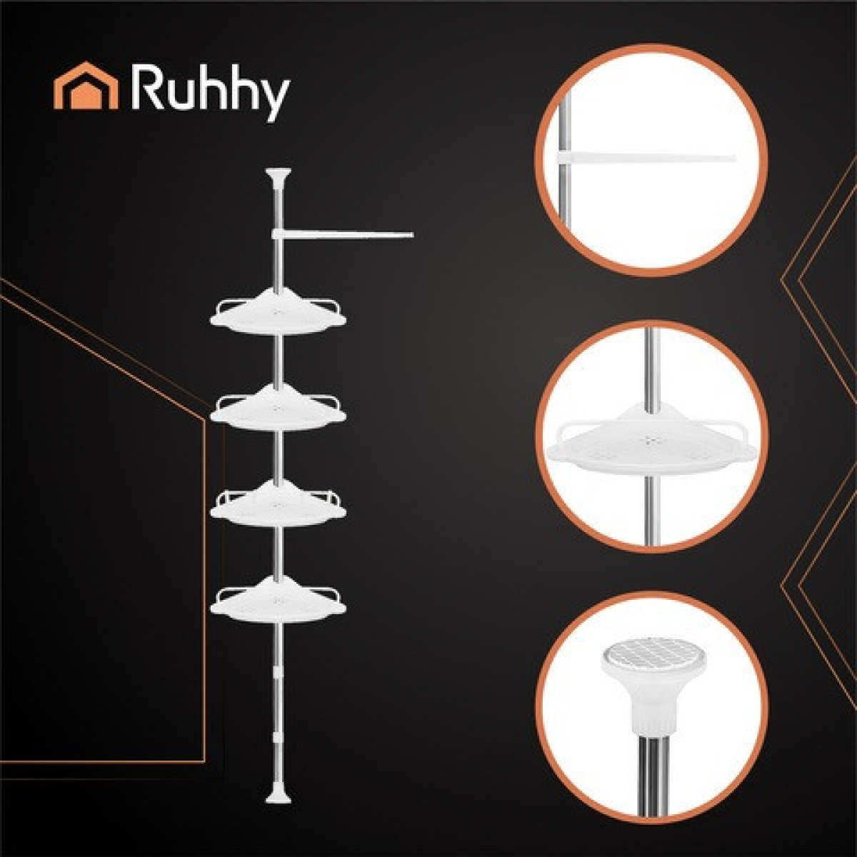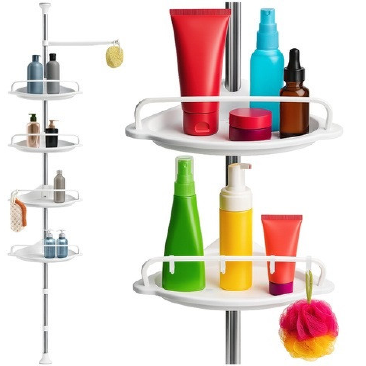 ПОРЯДОК, КОМФОРТ ТА СУЧАСНИЙ СТИЛЬ: Організуйте свою ванну кімнату за допомогою практичної телескопічної кутової полиці. Її регульована висота від 240 до 300 см дозволяє легко адаптувати її до будь-якого простору, не вимагаючи свердління чи зусиль. Чотири функціональні рівні (полиці розміром 33,5 x 21,5 см), додаткові гачки та вішалка дозволяють зручно зберігати косметику, губки, рушники та все необхідне банне приладдя. Це розумне рішення, яке забезпечить порядок та комфорт навіть у найменшій ванній кімнаті.