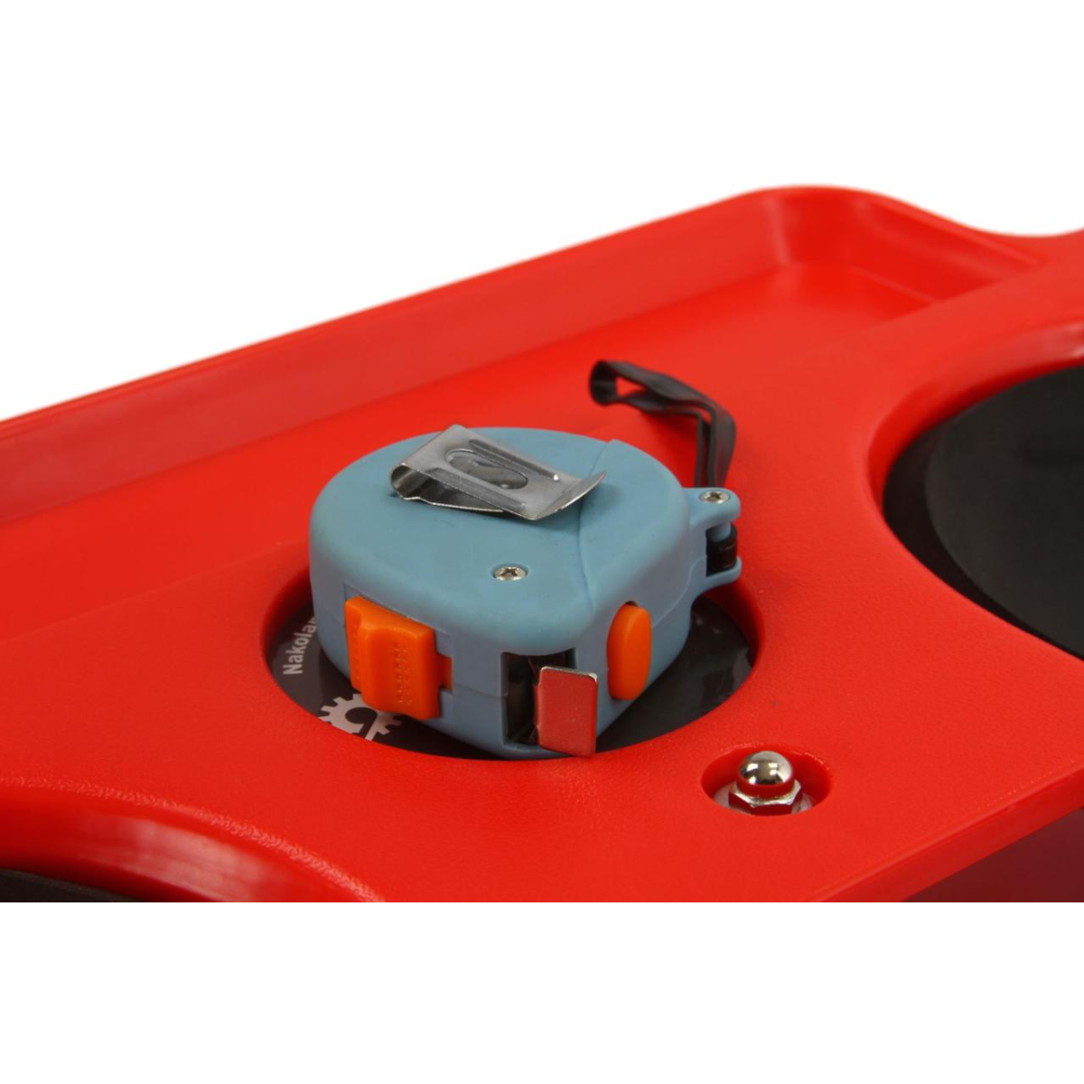 Цей наколінник на колесах – це не просто захист, а повноцінне робоче місце для комфортної праці навколішки. Його продумана конструкція включає не тільки м'яку підтримку для коліна, але й зручний органайзер для інструментів. Містке центральне відділення, два додаткові відсіки та окреме кругле місце для зберігання дозволяють тримати необхідні інструменти та аксесуари завжди під рукою. Міцні матеріали забезпечують тривалий термін служби виробу навіть при інтенсивному використанні в умовах майстерні чи будівництва. Завдяки розмірам 50,5 см (ширина) x 26 см (довжина) x 9 см (висота), він компактний для зберігання, але достатньо функціональний для роботи. Наявність ручки спрощує його перенесення між робочими зонами.