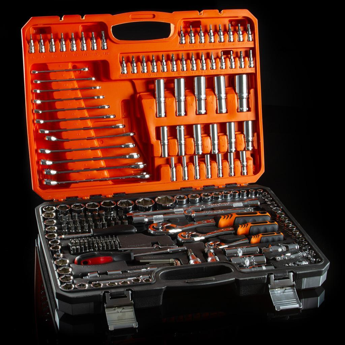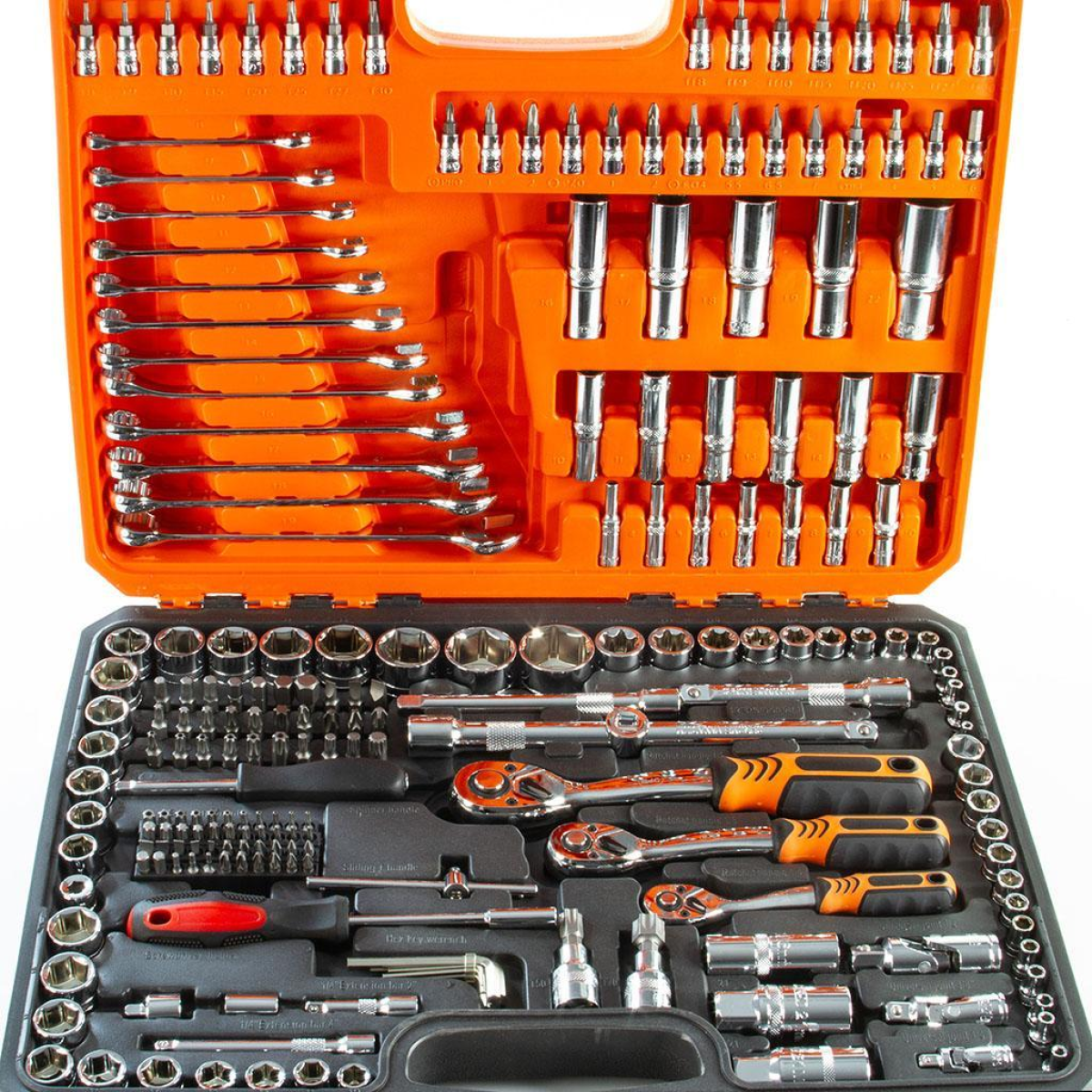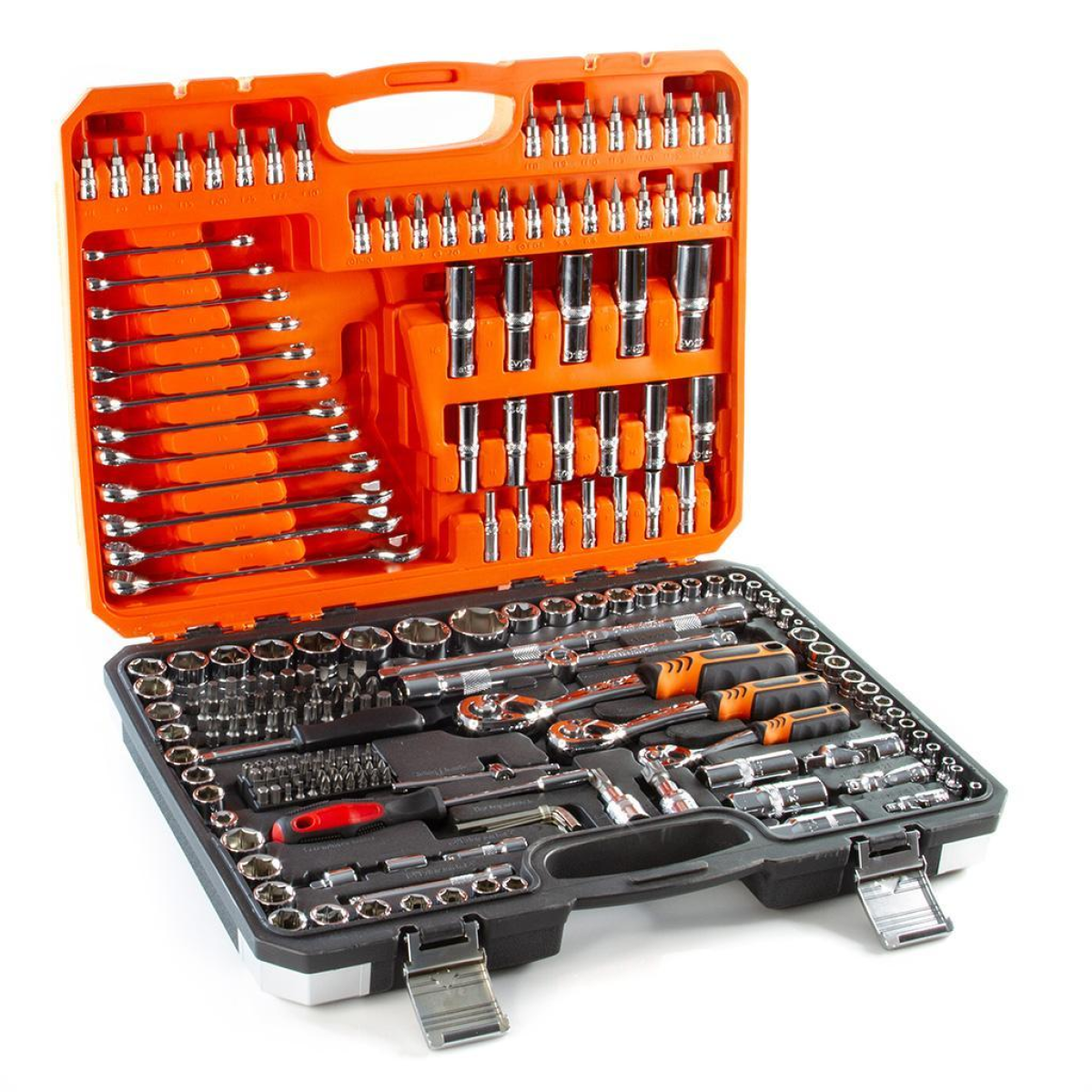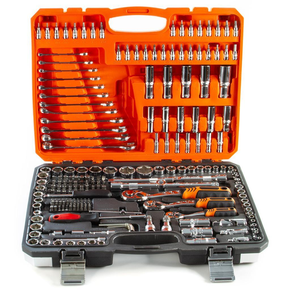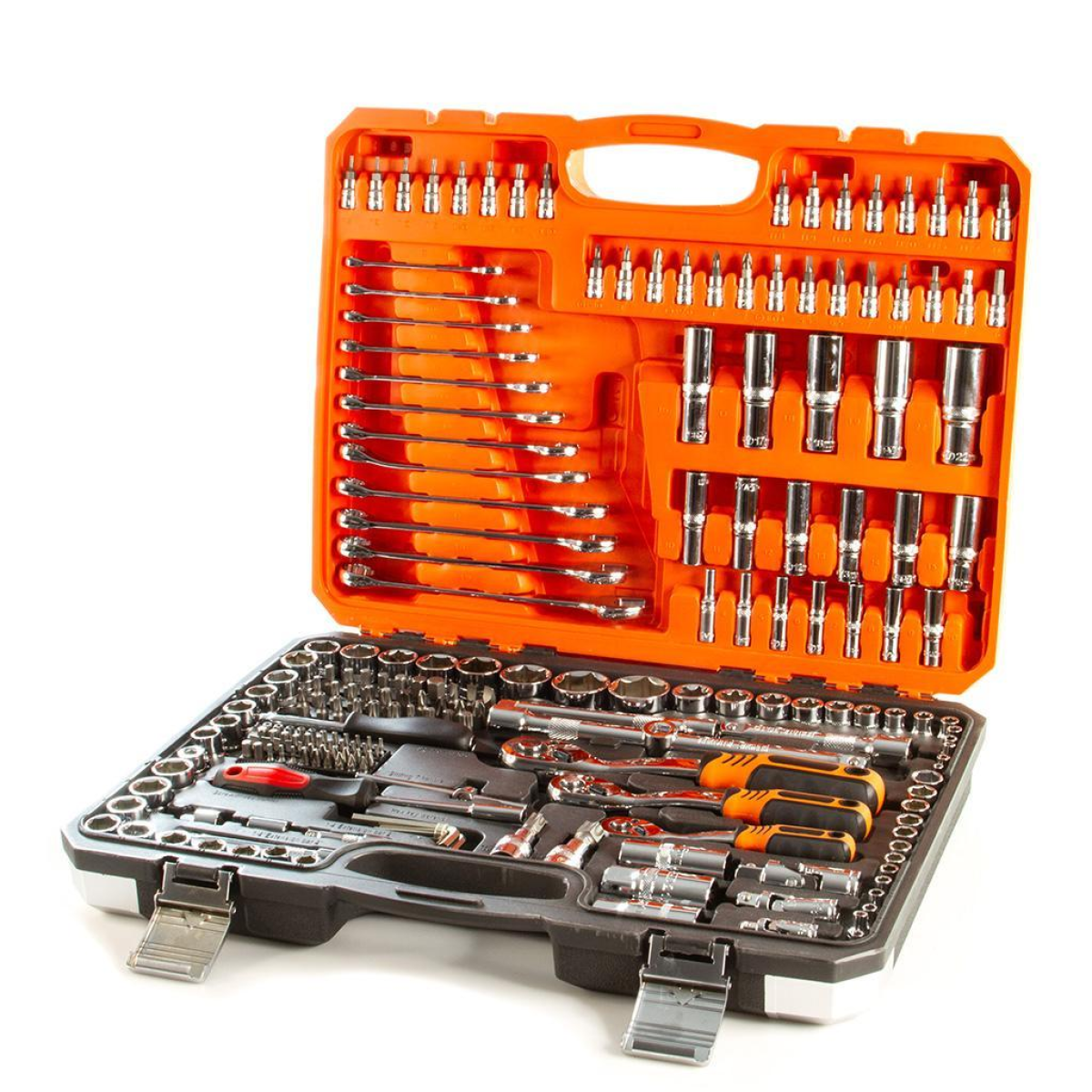 Опис товару Набір торцевих ключів BJC 216 елементів — це високоякісний професійний інструмент, який ідеально підходить для автосервісів, майстерень та домашнього використання. Виготовлений із міцної хромо-ванадієвої сталі CRV-50, що забезпечує довговічність та високу зносостійкість. Головки мають відмінну механічну міцність і високу стійкість до стирання, тріскачки оснащені високоякісним зубчастим механізмом. Комплект упакований у практичний пластиковий кейс для зручного зберігання та транспортування.
