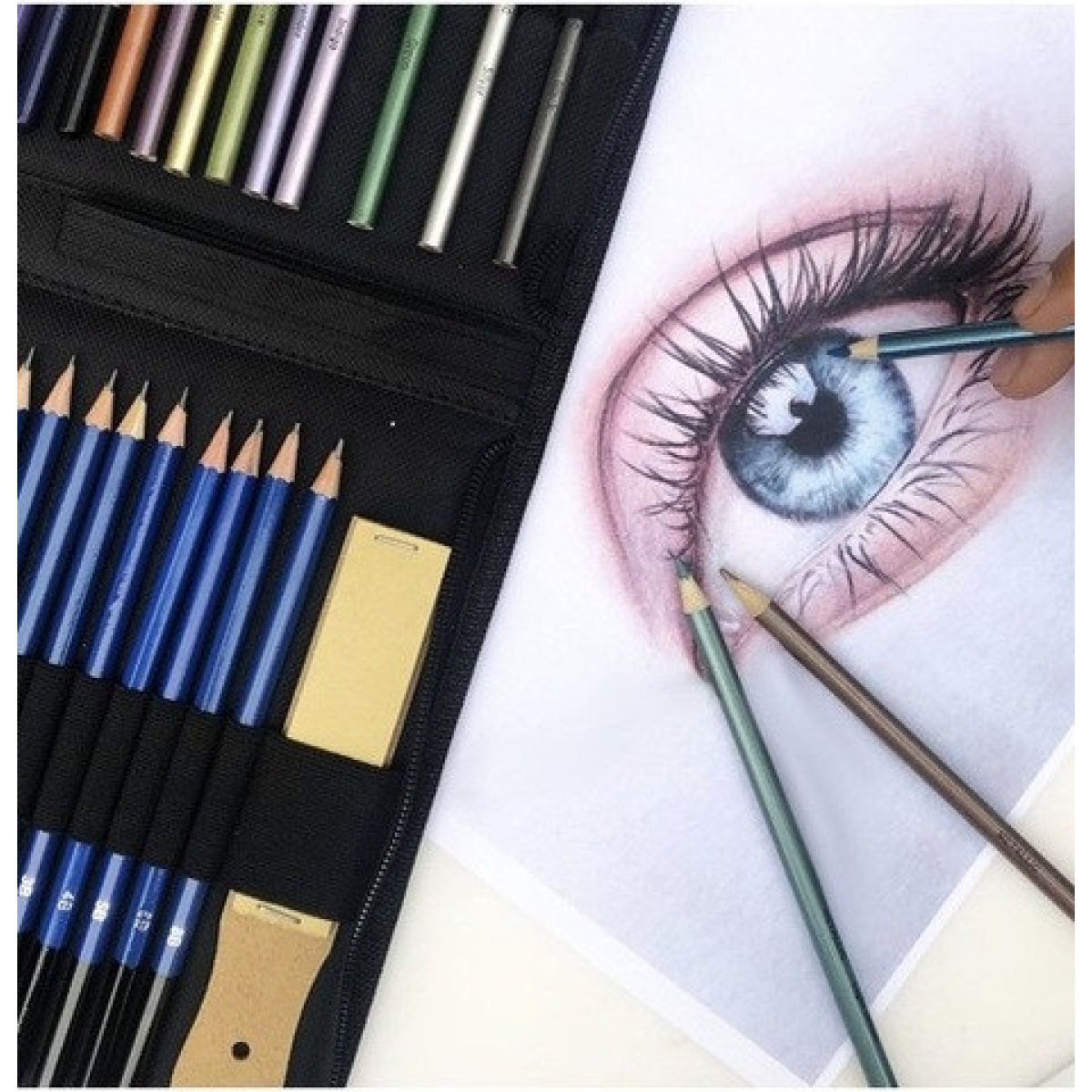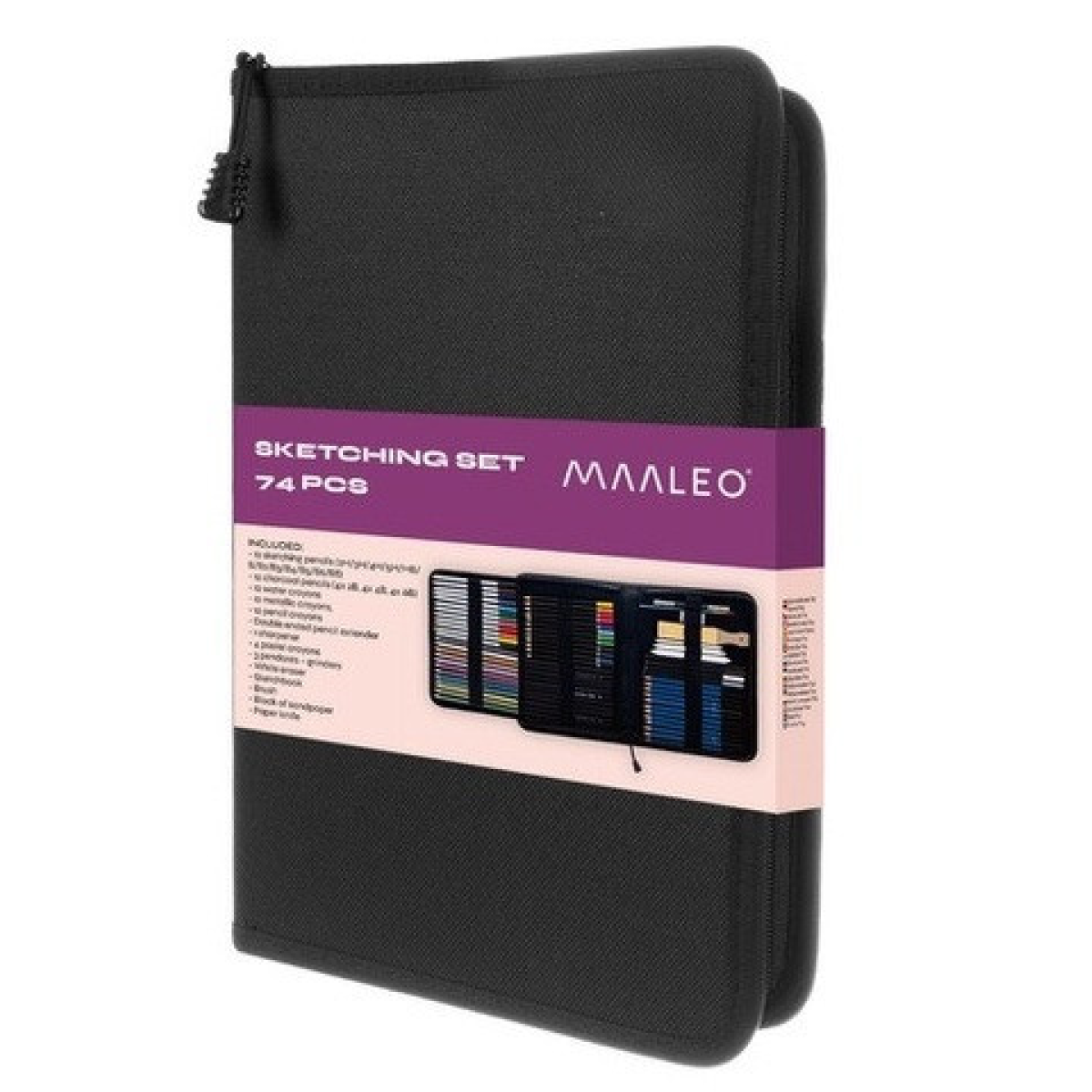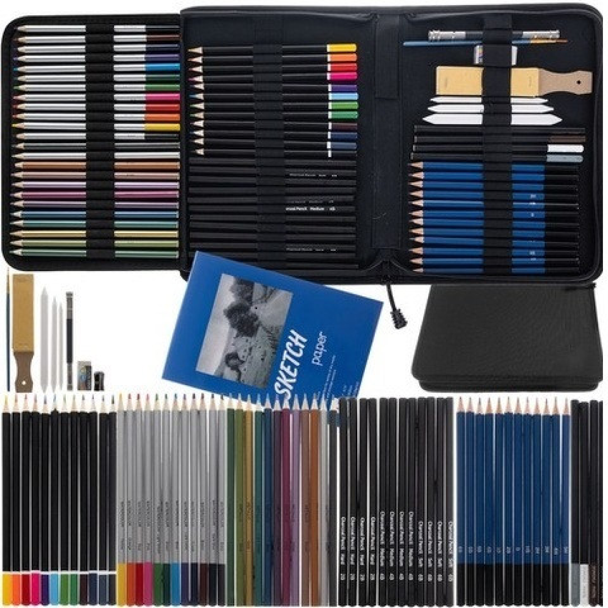 - 74 елементи: Великий вибір інструментів, включаючи олівці різної м'якості, вугільні олівці, водяну та металеву крейду, а також інші корисні аксесуари для малювання, ескізів та розмальовування.